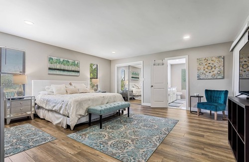 Beautiful modern 3700 sq ft ranch home on 4 acres w/3 spacious bedrooms, Huge living room w/ fireplace, full kitchen w/all the amenities needed. 1000 Sq Ft entertainment room with bar, pool table, games & 8 ft TV screen. Beautiful yards. Located near Stanislaus River, on the way to Yosemite. Great spot for river rafting trips which depart from Knights Ferry just 5 minutes away. Only 20 mi to Lake Tulloch, 30 mi to downtown Sonora, 40 mi to Columbia St Park, 45 mi to Angel's Camp.