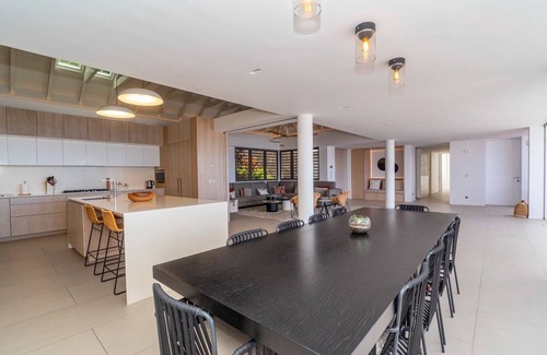 Airy and spacious, the modern living room of the luxurious villa D'Zir features comfortable sofas with soft cushioned benches, where you can enjoy a movie or your favourite series on Netflix. The minimalist and uncluttered decor with white walls and soft neutral tones brings serenity while watching the show outside. From there, the lines between outdoors and indoors are blurred, and the view over the ocean is majestic. The entire airy great room can be fully opened onto the expansive terrace with wide floor-to-ceiling windows that are completely concealed in the structure. Under the vaulted ceiling which brings a delightful feeling of volume, the large dining area is set up next to the terrace where guests can have meals facing the azure horizon. The massive dining table can accommodate up to ten guests around it. It connects the perfectly equipped kitchen with a breakfast bar for snacks at any time of day and a wine cellar.