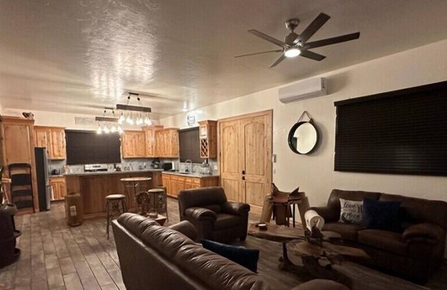 Main barn has consists with complete kitchen and has all you and your guests will need for a joyful stay. Full leaving room bed room #1 has 2 queen bed rustic made sleeps 4 with a Jack and Jill full complete bath and bathroom coming out to the beautiful rustic hand made master bed room sleeping 4. All rooms have smart tv with WIFI and a/c or heater and fans.