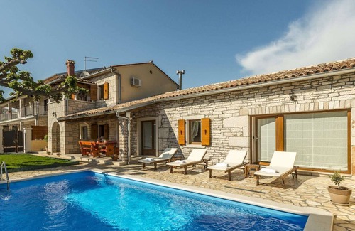 This beautiful stone villa spreads on 150 m2 and is ideal for 6 to 8 persons. The ground floor consists of a fully equipped kitchen, dining and living area with sofa bed for 2 additional guests and a terrace with garden furniture, a bathroom, a double room with air conditioning and private bathroom. The double bedroom o the ground floor has its own private entrance, so the guests staying in this big double room have complete privacy. The first floor consists of two air-conditioned bedrooms with double beds and a bathroom. One of the bedrooms has access to a beautiful terrace overlooking the pool, green garden, meadows and woods. The outside area consists of a 24 m2 large outdoor swimming pool with sun loungers, garden with barbecue, outdoor shower, covered patio with wooden table and chairs, barbecue and private parking for 3 cars. Next to the pool is a playroom with darts and table football. The Villa is located about 15 km from Porec and 15 km from the sea. The pool is heated only on previous request with an extra charge.