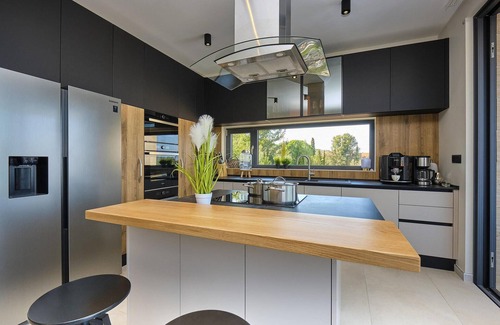 The stylish basement of villa Sunlight features a sleek wellness room with a sauna, a fitness room as well as a stunning wine bar, tavern with a charming indoor charcoal / wood grill, nice 7ft pool table and a gaming corner with a PlayStation console. Here, guests will also find the remaining bedroom with ensuite bathroom, a further separate bathroom and toilet, a laundry room, and a garage.