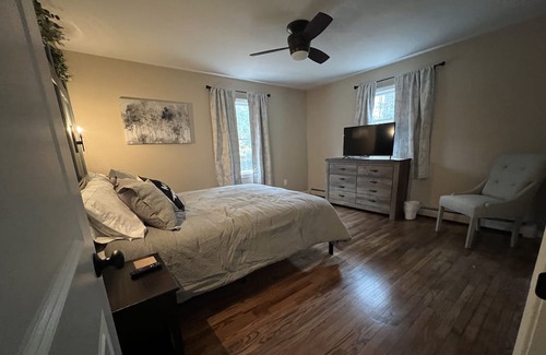 Master bedroom: Queen bed, usb night stands, dresser, TV and closet.