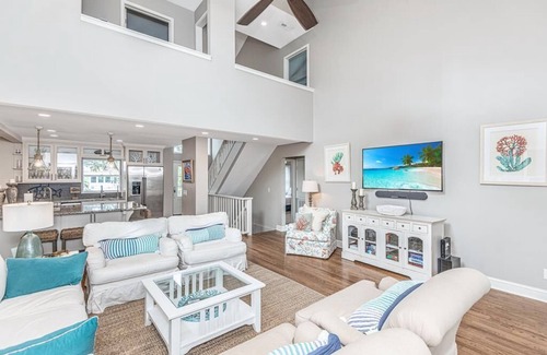The backyard features a large pool, a shaded dining table, 9 chaise lounges around the pool, a large hammock and lawn area for the kids to run around on. Outdoors you'll also enjoy the ping pong table, outdoor shower and basketball hoops in the pool and the front driveway. The house also offers a laundry room, garage with many beach chairs and games to take to the beach. There are TV's on 4 bedrooms, in the main floor living room and the downstairs game room. Board games, puzzles and pool towels are also provided. Linens are provided with sheets, towels and wash clothes. There is no elevator at this property.