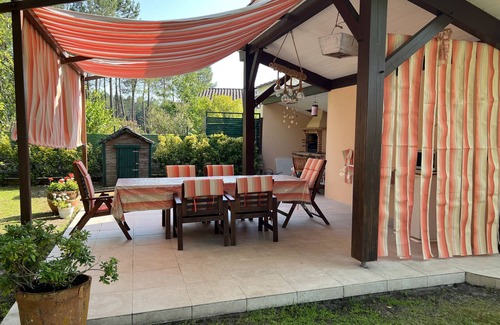 Rent recent holiday, sleeps 10. 3 bedrooms. 2 bathrooms with shower and bath. 2 toilets. Large fully equipped kitchen (dishwasher, induction hob, hood, convection oven and microwave). Excellent condition. Laundry room with washer and dryer. Large garden with terrace, barbecue, swing. House located in a dead end, safety for children, quiet housing estate on the edge of pine forest (all rooms have a view of the forest), close to the town including all shops (700 meters) and bike paths in the middle of the Landes pine. House located 9 km from the beach of Cap de l'Homy. Shuttle service to the beach in July and August from the town. Provision of bicycles of various sizes. Baby equipment possible. Bed linen and towels on demand.