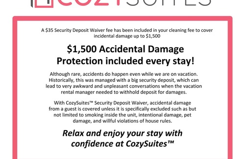 Although rare, accidental damage from guests does happen and traditionally this was managed via a security deposit by the guest or by the owner charging the guest for damages. This is highly unpleasant and puts a bitter taste in everyone's mouth. With our “all-risk” protection, all accidental damage by the guest up to $1,500 is covered unless it’s specifically excluded such as, but not limited to, normal wear and tear, infestation, or prior damage. Relax and Enjoy the stay! It’s vacation time, so enjoy it with the peace of mind knowing that if an accident happens and damage occurs, you are protected with CozySuites' coverage! A $35 damage deposit waiver has been included in the cleaning fee for this incidental coverage ($60 value!). This applies for all reservations made on or after 1/1/2021.