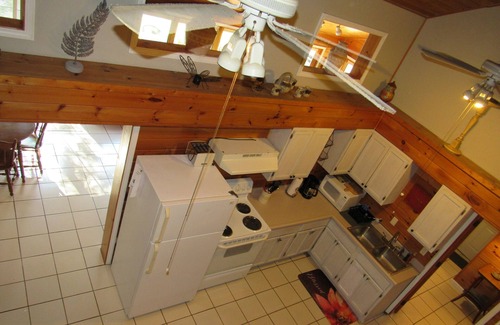 This get away consists of three bedrooms: two bedrooms and a large master loft. The master loft has a king-size bed, bamboo flooring, it's own bathroom, private second story deck area and a sitting area for leisure reading. Downstairs, the "Bollywood bedroom" features queen-sized, silk sari-draped canopy bed with cozy, pillowy bedding. The second downstairs bedroom consists of a full-size bed and a twin bed and sleeps three comfortably.