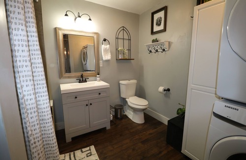 Walk into a charming country loft with exposes trusses. The open kitchen is beautifully designed with open shelves. The natural light flooding info the apartment creates a pristine calmness. The bedroom is positioned in front of two large windows that open to a large shaded backyard full of matured trees. This is one stay you won't want to miss.