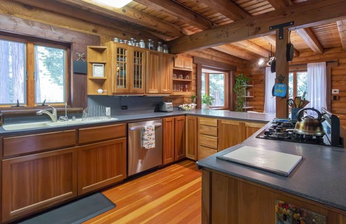 Beautiful log cabin on five acres replete with gardens, meadow, forest, hot tub, and cedar sauna. Stargaze from the hot tub, listen to the frogs and hooting owls, warm up by the fire, pick greens from the garden, relax on the deck, or cozy up and read. Three bedroom, two bath comfortable home.