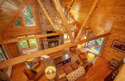 The house is equipped with a sound system throughout for entertaining. The cabin is warm and inviting with lots of natural wood perfect for relaxing.