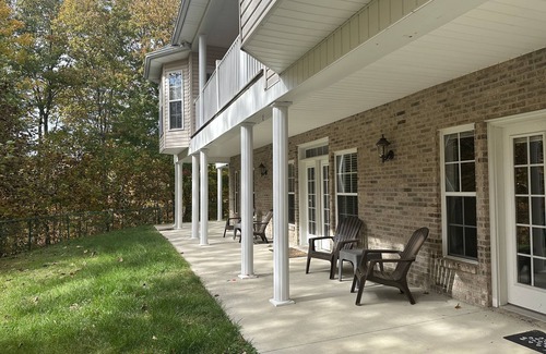 Main level features an open floor plan,vaulted ceiling in the main living area and entry. Also has a lovely fireplace, dining area and separate breakfast area, a beautiful kitchen with quartz countertops and an island eating bar. Also has a home office where the sofa turns into a bed with French doors. Home has a walk-in pantry, powder room, huge master bedroom with king bed, his and her walk-in closet, master bath with double vanity, jet tub and walk-in shower. Main level has hardwood throughout with tile in the bathroom and utility. Lower level has tile bathrooms and luxury vinyl in the bedrooms and family room. The covered concrete porch on the front and back wall access from the living room, dining room and master bedroom. The lower level has a large family room with fireplace, perfect for enjoying the provided board games and two bedrooms with queen beds, each with its own private bath. The covered patio in the lower level can be accessed from the family room and both bedrooms. Lots of storage great lighting a main level oversize garage, fenced in backyard so your pet is secure and safe. There is a large pond with Koi in the front of the property please do not feed these fish!There’s also a creek at the back of the property. Enjoy this beautiful park like setting as you get a little R&R!