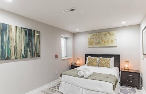 Downstairs, you will find 2 lavish and comfortable bedrooms each bedrooms featuring a Queen sized bed and 32" Smart TV's. Additionally another full modern bathroom. Inside the closet you will find the washing machine and dryer along with ironing items.