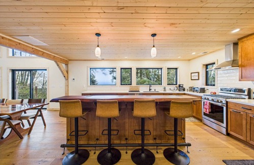 Inside you'll find new everything, but you may recognize a few items if you stayed at the old cabin. We have a custom redwood bar with a live edge angled and sanded smooth specifically so you can rest your forearm while you sip a beer or a glass of wine and stare out to the Pacific. Brand new appliances, quality cookware, sharp knives and a world class view will be loved by the chef in your group. A dry bar, wine rack and minifridge await your extra drinks and your cocktail creations. Downstairs are two cozy bedrooms with two new queen beds fitted with the coziest linen sheets. A bathroom with a lighted and heated mirror, heated floor, double vanity, and large tiled shower lies between the two bedrooms.