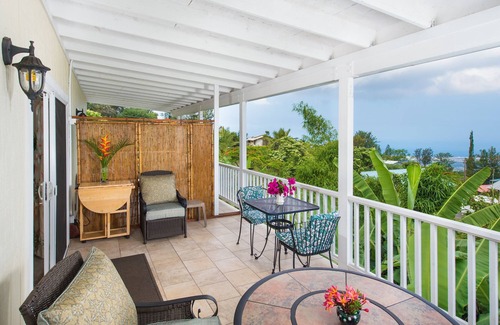 Great central location, on the hillside overlooking the Kona Coast, 7 miles north of downtown Kailua. 10 minutes from airport (no noise) for those late flights. Owners have been hosting Big Island visitors for 30 years, speak German, and are happy to share suggestions and answer questions if guests desire. We provide everything to make this your home away from home. Wake up in the morning to the sound of birds singing, and after a day of fun, relax on your private lanai, watch spectacular sunsets and listen to the gentle rustling of banana leaves.