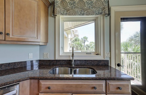 The dining area can seat up to eight and is located just off the kitchen and living area. As you make your way into the kitchen, you are greeted with more views of the beautiful Hilton Head Island beaches. The kitchen has stainless steel appliances and granite countertops. The washer/dryer is tucked away just off the kitchen area as well.