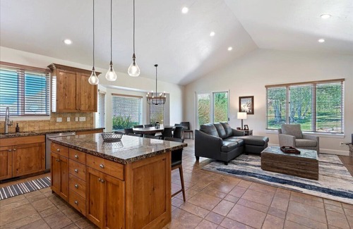 The open living room is ideal for gathering after a day in the mountains. It has plenty of room, large, bright windows, a gas fireplace, comfortable furnishings, and mountain views. The full kitchen features stainless steel appliances and is fully stocked with spices, dishes, coffee, utensils, and other extras.