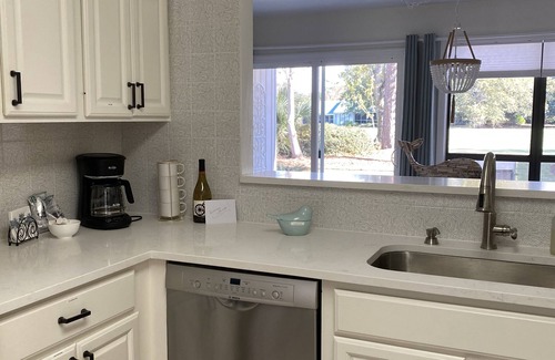 This charming and immaculate, just renovated 3/2, accommodates 6 (2 King Beds, One Queen, One Queen Sleeper Sofa) with a large dining table, 3 sitting areas, 2 televisions, free WIFI, and a patio table overlooking the 17th fairway! All in a bright and open floor plan.