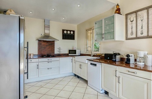 The villa is well-equipped with various amenities to ensure a comfortable stay. It features a large, open kitchen with four hot plates, an oven, dishwasher, microwave, freezer, and an electric coffee machine. Air-conditioning and forced-air heating are provided for climate control. Outside, you'll find a spacious 50 square meter terrace with furniture and deck chairs (seating for 10), offering a beautiful view of the garden. Other amenities include a washing machine, iron, children's high chair, baby cot for up to 3-year-olds, and a hair dryer. Complimentary WiFi internet access is also available.
