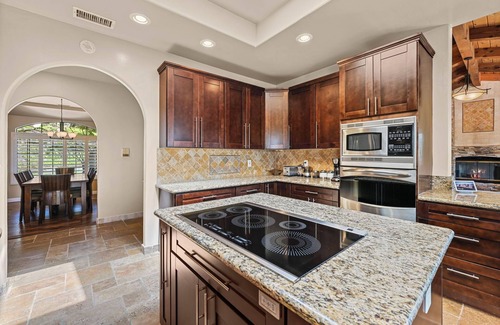 The single story Spanish style home features a large kitchen, adjacent casual dining area with a large picture window capturing the amazing mountain views; a large family room with exposed beam cathedral ceiling and a beautiful stone fireplace; a large living room with a beautiful stone fireplace and a baby grand piano; and a laundry room with state of the art washer and dryer. The spacious master bedroom has a king bed, a large picture window also capturing the amazing mountain views, and a large private luxury master bathroom with a Jacuzzi tub and a frameless shower all surrounded by beautiful travertine tiles. The second bedroom also has a king bed, and shares a luxury full bathroom with the third bedroom, which has 2 full-size beds. There are also 4 sleeper sofas, three of which have queen-size pull-out beds and one of which has a full-size pull-out bed in the family room and the living room. All bed sheets are of high quality with at least 400 thread count. There is also a separate 3rd luxury full bathroom with a claw-foot tub and a frameless shower, located next to the family room. The kitchen features new maple cabinets, granite counter tops, copper sink and new high end stainless steel GE Profile appliances including a 36 inch induction stove and a wine cooler.