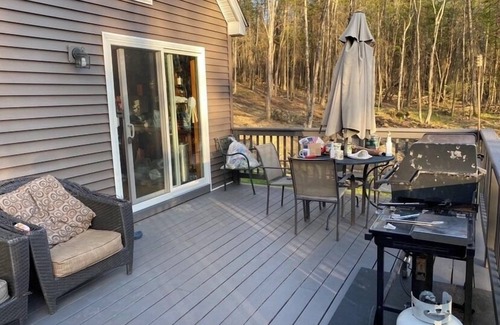 11 + secluded wooded acres with seasonal mountain views. Camp Matty is a newer cabin built in 2015 with all the conveniences of modern life. 3 bedrooms + loft (5 queens, bunk bed and a queen size sleeper sofa), 2 full size bathrooms (1 with tub and the other with a steam shower w/body jets, chromo therapy lights, and radio), kitchen, living room, family room and deck. There is a 65 inch flat screen smart tv in the living room and a 120' movie theater with surround sound in the family room hooked up to DirectTV/Apple TV along with a beautiful rustic Adirondack themed bar in the basement. There is a detached game room with dartboard, foosball table and board games for the family to suite your entertainment needs. Under the deck there is a 6 person hot tub with LED lights, multiple jets and water fall (special terms for use apply). Outdoor shower, internet, automatic standby generator, washer/dryer, dish washer, stainless steel appliances, hammock, propane grill, outdoor fireplace and the list goes on. Camp Matty is heated by radiant floor heat, a cozy wood stove in the living room and a wood pellet stove in the basement during the winter . We ask that guests bring their own sheets and towels. Blankets and pillows are provided. We can have the caretaker provide you with linens for groups traveling from a distance for an additional fee of $100. You can cross country ski or ride your snowmobile right off the property onto C-8 (the main trail which connects to Old Forge, Speculator, Newcomb and Tug Hill) which is 1,000 feet from the end of the driveway. Enjoy the local events in town such as annual 4th of July celebration, Annual Moose Festival or Rustic Wood/Antique Fair. Down hill skiing at Gore is a short 20 minutes away off route 28. The town mountain has snow tubing and an ice skating ring which is a 2 minute drive. Ride your bike 5 minutes during the warmer months to the local restaurants, ice cream parlor, movie theater, lakes or one of the white water rafting companies located right in town. 3 lakes (Adirondack, Abanakee and Indian Lake) with public beach and park within 5 minutes of the property. Scenic Indian Lake has a full service marina to rent pontoon boats, speed boats or canoes/kayaks. There are tons of hiking trails, the scenic North County Railroad in nearby North Creek and scenic paddle boat dinner cruises nearby. 15 minutes to the Adirondack Museum in Blue Mountain Lake, 45 minutes to Lake George, under an hour to Old Forge or Saranac/Lake Placid (Winter Olympics 1932&1980) High Peaks region or Saratoga (visit the race track or SPAC for a concert). ..!