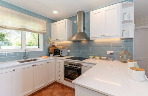 The villa is a beautiful villa 186 Menorcan style, recently renovated. Located on the hilltop of San Jaime, enjoys magnificent views of Son Bou and its beach. We access it from the terrace through large windows, and found a practical living / dining room fully furnished with new LED TV Samsung 48 inches, separated from the kitchen by a breakfast bar.