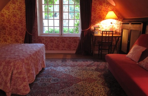 The ROSE ROOM is located on a second floor and has a window opening to a splendid view of our garden and it's perfect for couples. The spacious room has an entrance hall and an en-suite bathroom with a bath, wash basin, bidet and a separate WC. The towels and bed linen are provided and included in the rate. There are tea/coffee tray, radio alarm clock , hair dryer and a fan. Baby cot is available on request. There is a sofa bed in the room which can be used for an additional €17 fee per person per night.