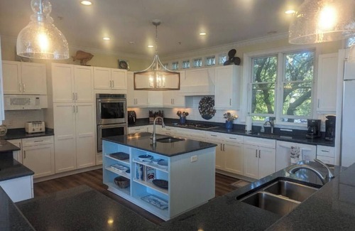 The living room is a perfect place to gather to watch a movie at the end of the day featuring plenty of seating, a flat-screen television with DVD player, and an expansive bookshelf. Enjoy preparing meals in the fully-equipped gourmet kitchen and dine at either, or both of the 10-person dining tables. Just in case that's not enough, there's additional seating at the counter. An air fryer and outdoor gas grill are also available.