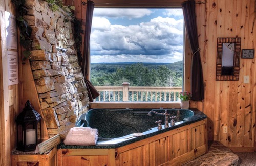 Retreat to the master king bedroom, where you can unwind in a luxurious jacuzzi tub set against a rock-faced wall. Enjoy the picturesque views of the North Georgia Mountains through the large picture window, and catch your favorite TV shows or with a DVD player. Step outside to the private hot tub and soak in the unobstructed beautiful views.