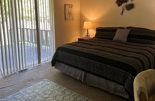 The king master has its own exit onto the spacious back deck and yard. The second bedroom has a queen bed and two twin beds compliments the third bedroom. The couch in the TV room rolls out to accommodate two more people if needed. There are 2 full baths.