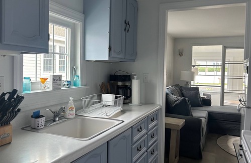 o Escape to this charming 2-bedroom, 1-bathroom beach cottage, just steps from Kinney Shores Beach. Perfect for families, couples, or friends. This retreat comfortably sleeps six with a queen bed, two twin beds, and two pull-out sofas.