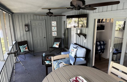 Park like setting. This 3 BR 2 bath newly renovated private single family friendly home is located waterfront on the lagoons of Kingston Cove, in Shipyard Resort. ( no fishing in the lagoons) Large second level screened in porch with overhead fans and a large screen tv overlooking the water. Five min bike ride to the beach. ( courtesy bikes and beach chairs included) 15 to 18 walk or 4 min car ride. Beach shuttle is also available for small fee. Great surf fishing. A true paradise for biking on endless bike trails including the unique ability to cycle on the beach the entire length of the island. ( no E-bikes permitted in Shipyard or other vacation resorts) Complimentary bikes with beach trailer are included. Boasting a 27 hole championship golf course, the renowned Van Der Meer Racquet/Tennis Club, and the gorgeous Sonesta beachfront hotel and resort with beach bar and restaurants. The number one location on Hilton Head Island for access to full service shopping and restaurants. Courtesy beach chairs, beach toys, etc available. Kingston Cove's quaint private pool is less than 100 yards from your front door. Bathrooms, showers and chairs available. Overhead fans throughout the home. Open the large windows turn on the fans and enjoy a breezy lagoon front home teaming with wildlife to observe.