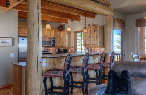 Situated on an end lot in Moonlight Basin, Big Sky, this home offers privacy, comfort, and, at 2,355 sq ft, loads of well-appointed living space for your whole group. A warm mix of western mountain décor and old warm charm is found throughout the home. The great room is spacious, yet cozy with a crackling wood fireplace and perfectly framed views of the Montana alpenglow over mountains.