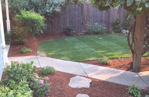 DESCRIPTION: This is a luxurious and comfortable home. Two bedrooms and one bathroom are located upstairs, all other living areas (one bedroom, den, bathroom,kitchen,family room) are located downstairs. Enjoy wine/coffee on one of the front porches (there are two) while looking out at the gardens or dine/relax under the stars on the back patio. The fully stocked kitchen lends itself to simple or sumptuous meals or you can walk to Ashland’s finest restaurants on A-Street, 4th Street and Downtown. The Ashland Food Co-op is less than two blocks away. The house itself is surrounded by colorful gardens.