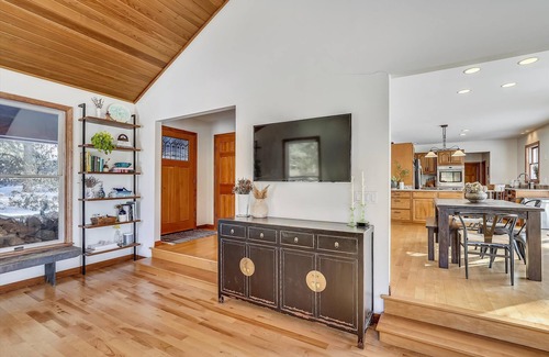 This tastefully renovated farmhouse has an open flow between the kitchen, dining, and living rooms. Plenty of windows and glass sliders offer spectacular mountain views—especially in the winter!— and let in natural light for a bright and airy feel. This main level also includes two spacious bedrooms and a full bath. The upper level is dedicated to the primary bedroom, a full bath, and rooftop deck with sweeping vistas. The den on the lower level offers bonus hang-out space for your family and friends. Outside, the property is made for fun! For winter visits, you can even enjoy the firepit while building snowmen. Blue Spruce is tucked away off the road for plenty of privacy. A favorite for families!
