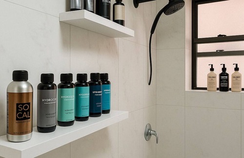The room includes a comfy double bed with hotel-quality linens, fresh towels, and pillows provided for your stay. Large windows with blackout curtains bring plenty of natural light while ensuring a restful night’s sleep. A smart TV, chic lighting, and decorative citrus artwork create a cozy atmosphere to relax after exploring the city.