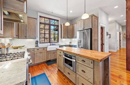 The primary bedroom boasts a California King bed, while the upstairs and downstairs guest rooms both have Queen beds. The downstairs Bunkroom has two sets of bunk beds (the lower bunk is a full-size, and the top bunk is a twin-size) and two twin-size trundle beds underneath. In addition to the amenities at the home, as a guest at Bluegill Lodge, you will also be able to enjoy the exclusive amenities within Camp Lake James for the duration of your stay—take a dip in the pool, explore the lake by kayak, grab a quick bite at the Canteen, curl up by the stone outdoor fireplace, and enjoy community-led activities to your heart's content.