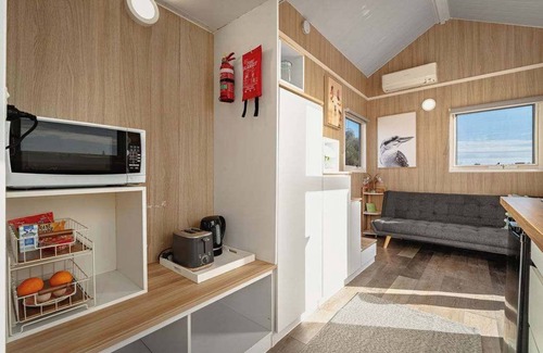 Bluestone Alpacas: The Alpaca Deluxe by Tiny Away is located in the rustic countryside of Merbein, the closest city, Mildura is 12 minutes away. Our secluded tiny home comfortably accommodates up to three guests. Upon entering the main driveway, continue past the carport—you’ll find the first tiny house tucked behind a polished tin and rustic recycled wood fence.