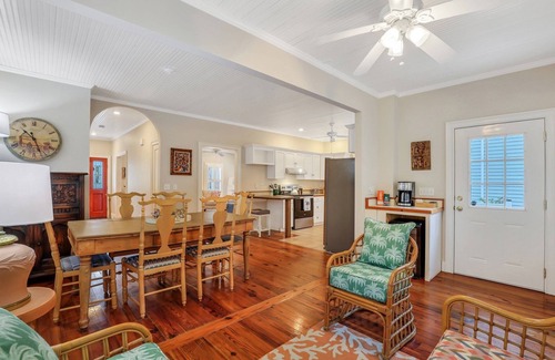 Majestic live oaks with Spanish moss sway in the saltwater breeze from nearby May River and welcome you into this Old Town Bluffton residence. Enjoy outdoor living at its finest on the expansive front porches, with views of charming Southern architecture and streetscapes that surround the home. Once inside, antique heart pine flooring leads to the spacious living room that features comfortable seating and a 55" smart TV to access your personal streaming services and indulge in your favorite movies or cheer on your sports team. The well-equipped kitchen is found adjacent and has everything needed to create a culinary delight! Enjoy family meals and game night at the large dining room table or converse over libations in the adjoining "keeping room". A convenient powder room is also located on the main level.