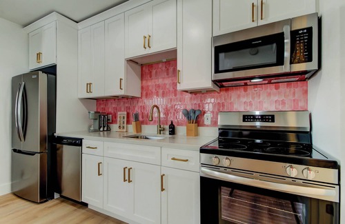 Inside you'll immediately notice the light and bright blush tones, complemented by elegant gold accents. This modern and fun decor creates a comfortable and welcoming atmosphere, perfect for your vacation retreat. The open-concept living space is thoughtfully designed for you to unwind and relax with your loved ones after a sun-soaked day exploring the nearby beach.
