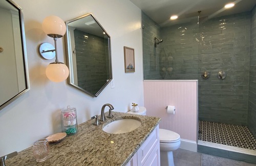 Primary Bedroom / Bathroom - features a Queen size bed and recently renovated en suite bathroom with dual shower heads. Beautiful and light filled during the day, and blackout curtains ensure you'll have a great nights sleep.