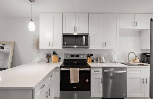The fully-equipped kitchen features everything needed for your culinary adventures, from essential appliances to a Keurig and French Press for your morning brew. Both bedrooms feature plush queen-size beds with soft sheets and various pillow options, ensuring restful nights.