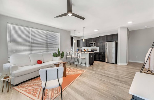 As a guest of Properties by Preston at Bold on Blvd, you'll enjoy exclusive access to your private sanctuary, featuring 2 cozy bedrooms, 2 bathrooms, a spacious living room, a fully stocked kitchen, a convenient laundry closet, and your own private balcony for unwinding under the stars.
