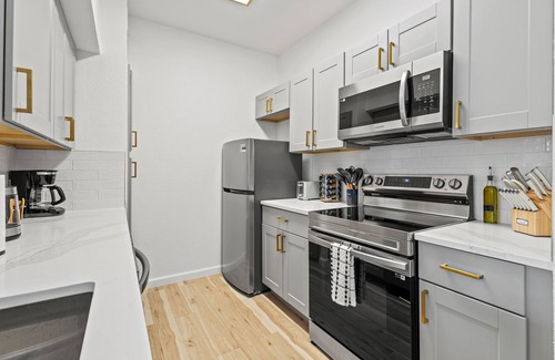 Inside, enjoy an open-plan living area with modern wood-plank flooring, natural light, and a cozy fireplace. The fully stocked kitchen flows into the living space, ideal for nights in or hosting friends. Retreat to your private bedroom with a luxury King bed for restful sleep after exploring Dallas.