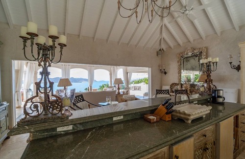 For your meals, a decorated stone table is on the covered part of the terrace, where guests can have meals and spend nice moments in the luxury and beauty of St-Barths. Both kitchen and living areas open onto the terrace, where the massive infinity swimming pool blends with the deep blue ocean. The view is fantastic as there is a perfect symmetry provided by the pool surrounded by deck chairs. Relaxation areas and sofas in an Italian style are set up with sitting areas under large umbrellas that filter the Caribbean sun.