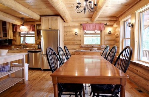 This stunning log home is custom-built with three levels of living space that include a walk-out basement with a stone patio and hot tub. There are 5 bedrooms and 3 bathrooms, with sleeping for up to 13 people, all nestled on a private 1.2-acre wooded lot. There are beautiful hardwood floors and a two-sided wood fireplace between the great room and kitchen.
