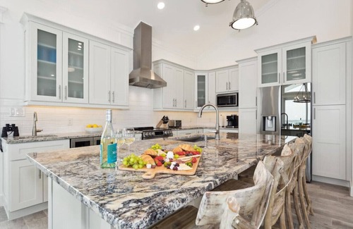 The large kitchen area includes a double door refrigerator with ice maker, an under counter ice maker, a luxurious Ruvatti meal prep sink, a bar sink, and a wine cooler.