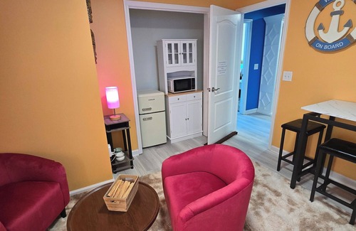 There are two guest rooms on the second floor with keyed locks if you wish to secure your guest room(s) before planned social events begin. Guest rooms come with a queen bed, night tables w/ drawers, 55” smart television w/ remote, wall table w/ drawers, ceiling light and fan w/ remote, lamps w/ remotes, chairs, a room divider, a walk-in closet, an ironing board, a laundry hamper and hangers. At any time that you need extras of anything or adjustments made to heat or A/C, we are available by text to provide reasonable adjustments for your comfort.