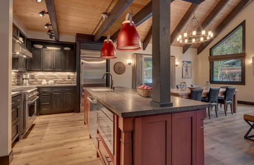 Tahoe Luxury Properties welcomes you! Bradley's Bungalow is the perfect retreat for you and your immediate family. This adorable Dollar Point vacation rental boasts a beautiful and spacious backyard, professional interior design, and an ideal location, just three miles from Tahoe City. The open floor plan naturally creates inclusive conversation and activity in the lower level. The gorgeous kitchen, with all new appliances, a large trestle dining table, and a living room with comfortable furnishings and a cozy, wood-burning fireplace are just a few of the highlights. The pine ceiling and hewn hickory floors are a warm compliment to the minimalist and modern touches throughout, while the local art gives you the feeling of being immersed in Lake Tahoe. Both adults and kids will appreciate access to their own private bedroom and bathroom, three of which have smart televisions. The loft serves as additional space to stretch out and enjoy reading, while not having to formally retire to a bedroom. In the summer, grill your shrimp kabobs and corn on the deck and enjoy your dinner al fresco. Your kids will enjoy the uncharacteristically large backyard and lawn area, perfect for tossing the frisbee or building a snowman. Relish relaxing in the bubbling hot tub at the conclusion of your activity-filled days.
