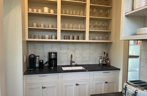 The well-appointed open concept living and kitchen was designed to accommodate a crowd. The kitchen features a commercial grade 48 inch stovetop, double wall ovens, two dishwashers, column refrigerator and freezer, large island with seating for five and plenty of storage. The butler's pantry has an extra refrigerator, an extra sink, coffee bar with both a Nespresso verturo machine and drip coffee maker as well as every other small appliance you could want or need. The adjacent dining area has a 12 ft dining table and seats up to twelve people. Finally, the comfortable living room has a cozy stone fireplace, two sofas, and a Frame TV.