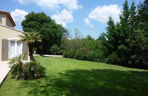Typical house in provencal style with private pool and huge garden (4000 m2). 6 Bedrooms with extra large beds (180X200) . 2 bathrooms in the main house with 2 separate toilets.Little house with bedroom just a few meters from the main house with bathroom for those who like more independence. Large living room with fireplace. Linen and towels are provided. Private swimming pool (10x5m) with alarm system The house is perfect for 2-3 families. In the garden you can find a large play ground for 'boules', typical French play and children swings. Large terrace with multiple sunchaires around the pool. Large barbecue and comfortable sofas to spend the evening.