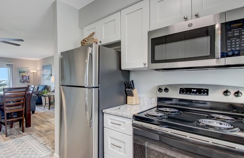 The home's beautiful kitchen shines with all-white cabinetry topped with natural-stone countertops. This kitchen puts everything at the chef's fingertips with a nice work triangle featuring a full-sized refrigerator, dishwasher, stove, and microwave in stainless steel. The kitchen is also stocked with a coffee maker, toaster, and many more cooking essentials for enjoying as many meals at home as guests desire! The kitchen conventionally houses the home's full-sized front-loading washer and dryer.